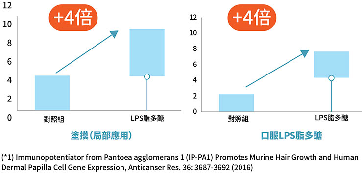 在日本人員研究下,LPS脂多醣已經可以由植物提取,並經特定米糠精密發酵而成,並應用於內服外用之中。經臨床研究證實,無論外搽抑或服用LPS脂多醣,有效激活4倍育髮力*。