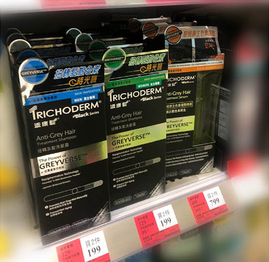 喺香港就有頭髮品牌(添康髮)取得「黑髮肽GREYVERSE™」成分並製成「髮根原生色素復甦精華」,仲喺日本製造,標榜唔係染髮劑,唔係幫頭髮上色,唔會刺激頭皮,男女都啱用,特別係初老顯白者、想預防灰髮者。