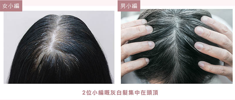 為咗證實呢隻「黑髮肽」係咪咁堅,三十中男女小編決定親身試用,去年開始出現灰白髮,都屬於「初老顯白」,大家啲灰白髮主要集中在頭頂,約有10條8條(男小編就多少少),閃閃令都幾礙眼,所以平時會集中染頭頂。